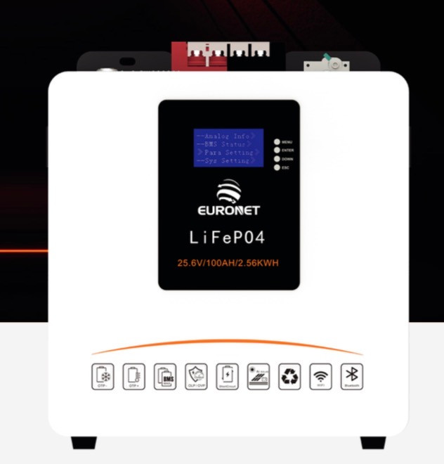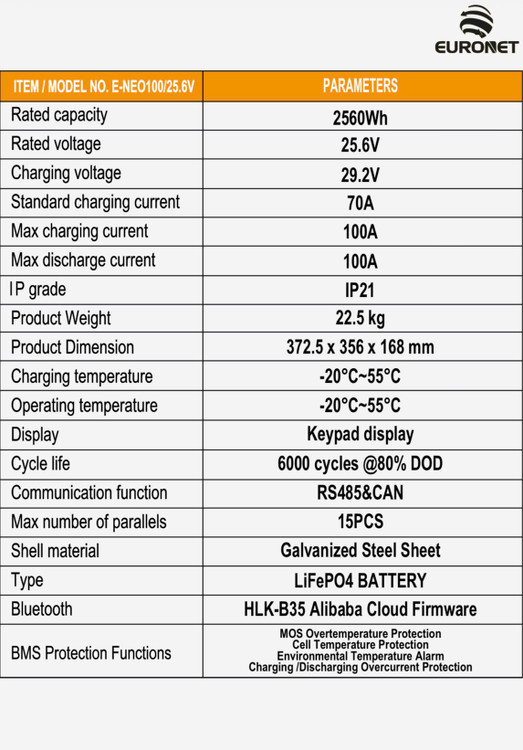 این مدل از باتری یورونت با ولتاژ نامی 25.6 ولت، جریان شارژ استاندارد 70 آمپر و حداکثر جریان شارژ و تخلیه 100 آمپر طراحی شده است.