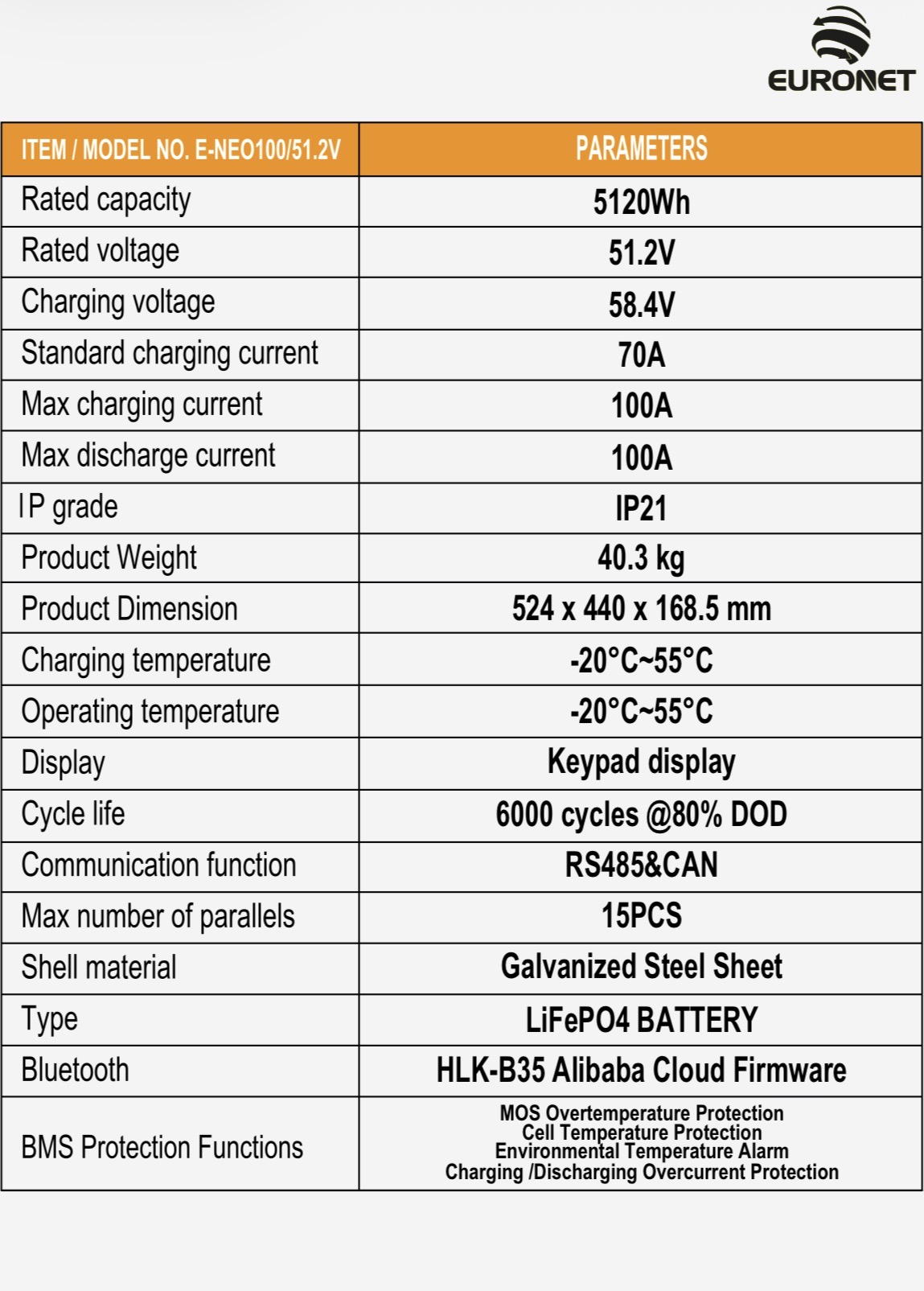 باتری لیتیومی هوشمند 100 آمپر ساعت 51.2 ولت EURONET مدل NEO 51.2V 100AH: